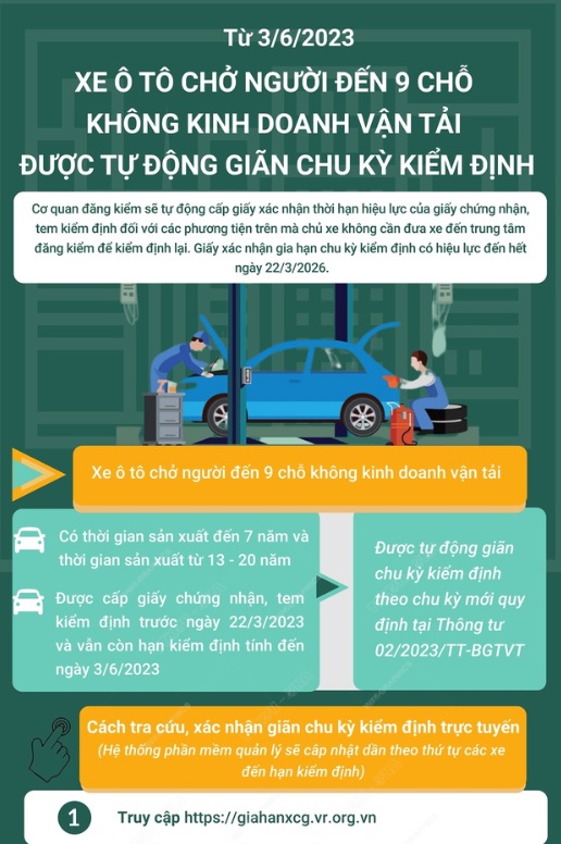Theo đó, các xe ô tô chở người đến 9 chỗ không kinh doanh vận tải (có thời gian sản xuất đến 7 năm và thời gian sản xuất từ 13 - 20 năm) đã được cấp giấy chứng nhận, tem kiểm định trước ngày 22/3/2023 và vẫn còn hạn kiểm định tính đến ngày 3/6/2023 sẽ được tự động giãn chu kỳ kiểm định theo chu kỳ mới quy định tại Thông tư 02/2023/TT-BGTVT.