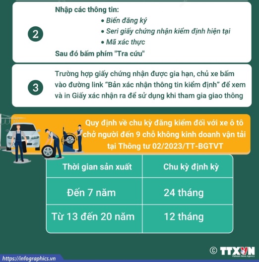 Để được gia hạn đăng kiểm, kể từ ngày 3/6 chủ xe có thể vào trang web Cục Đăng kiểm Việt Nam để tra cứu thông tin và in Giấy xác nhận thời hạn hiệu lực của giấy chứng nhận, tem kiểm định. Giấy xác nhận này là giấy tờ kèm theo không tách rời của Giấy chứng nhận kiểm định đã được cấp để tham gia giao thông đường bộ theo quy định.