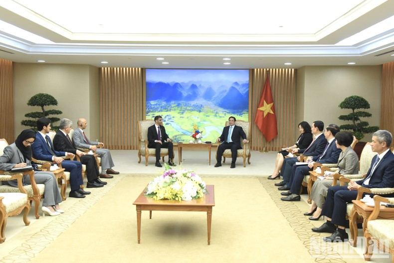 Thủ tướng Phạm Minh Chính tiếp Tiến sĩ Thani bin Ahmed Al Zeyoudi, Quốc vụ khanh phụ trách Thương mại quốc tế, Bộ Ngoại thương UAE. (Ảnh: TRẦN HẢI).