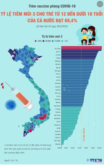Tỷ lệ tiêm mũi 3 cho trẻ từ 12 đến dưới 18 tuổi trung bình trên toàn quốc là 69,4% với tổng số 5.813.288 liều vaccine được tiêm.
