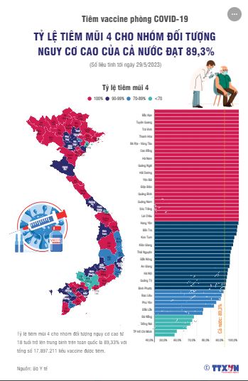 Tỷ lệ tiêm mũi 4 cho nhóm đối tượng nguy cơ cao từ 18 tuổi trở lên trung bình trên toàn quốc là 89,33% với tổng số 17.897.211 liều vaccine được tiêm.