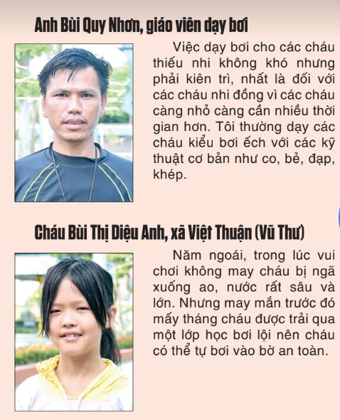 Trong cái nắng gay gắt, làn da ngăm đen vì thường xuyên phơi mình dưới nắng để dạy bơi cho thiếu nhi trong xã, anh Nguyễn Duy Ngọc, Bí thư Đoàn xã Hòa Bình (Kiến Xương) cho biết, trên địa bàn xã hiện có 2 bể bơi cố định, mỗi ngày thu hút khoảng 60 lượt trẻ em đến học bơi vào hai buổi sáng và chiều. Anh Ngọc thấy vui mừng vì trẻ em trong xã đã có điều kiện thuận lợi để được vui chơi trong dịp hè. Học bơi lội không chỉ rèn luyện sức khỏe mà còn giúp các em có được kỹ năng xử lý tình huống khi cần thiết. Xã Hòa Bình có sông Kiến Giang chảy qua và nhiều ao, hồ khác, nơi tiềm ẩn nhiều nguy cơ về đuối nước nên việc trẻ em được học bơi là điều rất cần thiết.