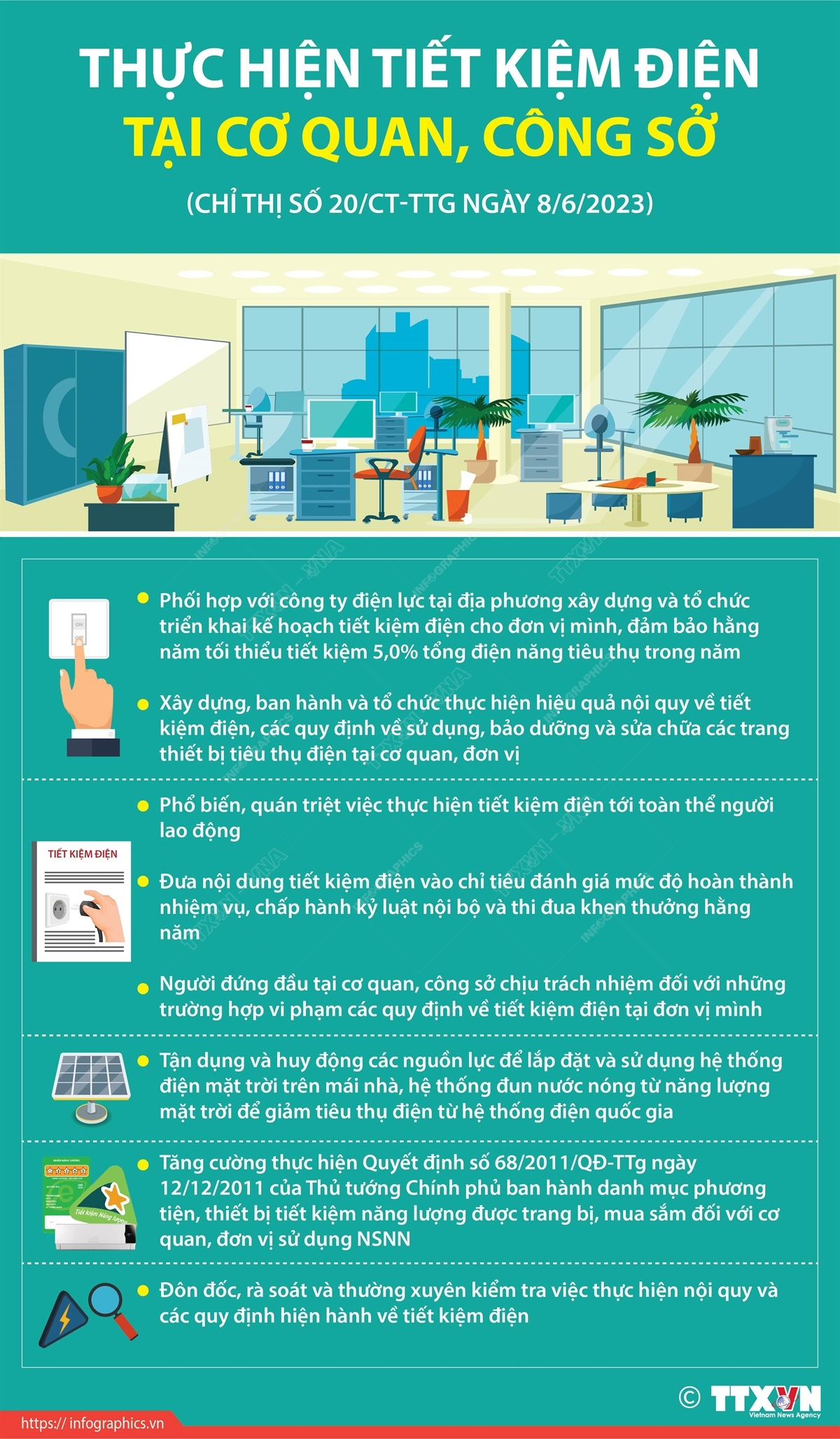 Ngày 8/6/2023, Thủ tướng Chính phủ đã ban hành Chỉ thị số 20/CT-TTg về việc tăng cường tiết kiệm điện giai đoạn 2023-2025 và các năm tiếp theo. Thủ tướng yêu cầu, thực hiện một số giải pháp sau để tiết kiệm điện tại cơ quan, công sở.