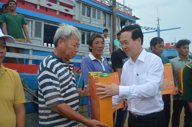 Chủ tịch nước Võ Văn Thưởng thăm hỏi, tặng quà các ngư dân tại Cảng Phú Quý. (Ảnh: ĐÌNH CHÂU).
