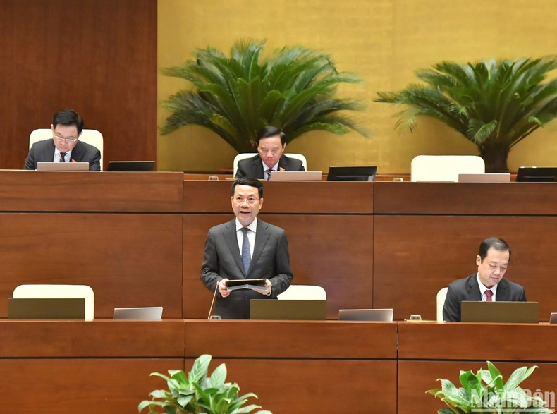 Bộ trưởng Thông tin và Truyền thông Nguyễn Mạnh Hùng giải trình, làm rõ một số vấn đề đại biểu Quốc hội nêu. (Ảnh: ĐĂNG KHOA).