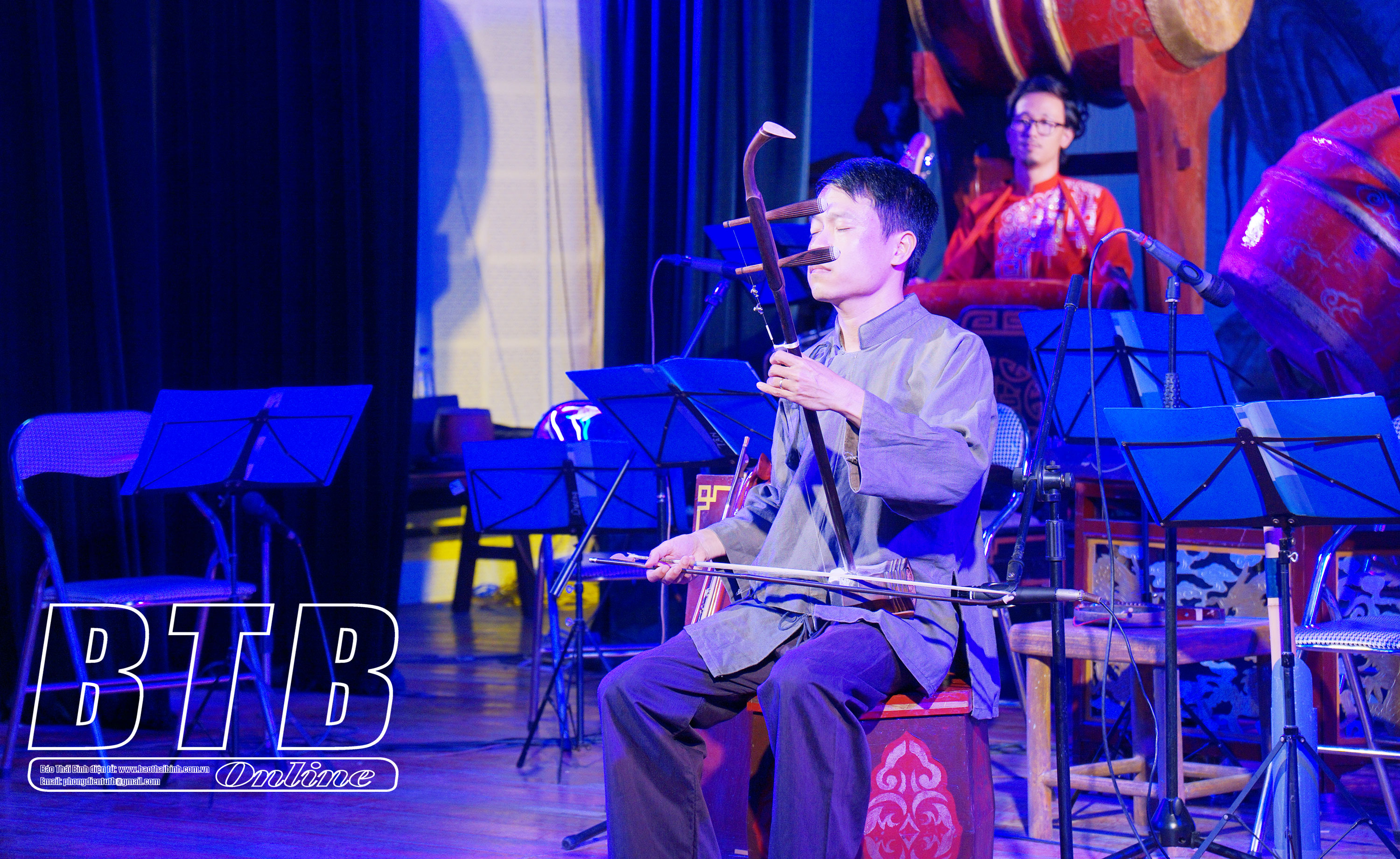 Các nhạc công Nhà hát Chèo biểu diễn hòa tấu nhạc cụ dân tộc.