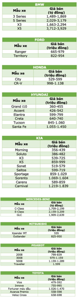 Như vậy, với mức giảm 50% lệ phí trước bạ, người mua ô tô có thể tiết kiệm từ vài chục cho tới vài trăm triệu đồng chi phí lăn bánh xe mới. Dưới đây là danh sách cụ thể các mẫu xe sản xuất, lắp ráp trong nước thuộc diện được hưởng ưu đãi 50% lệ phí trước bạ.