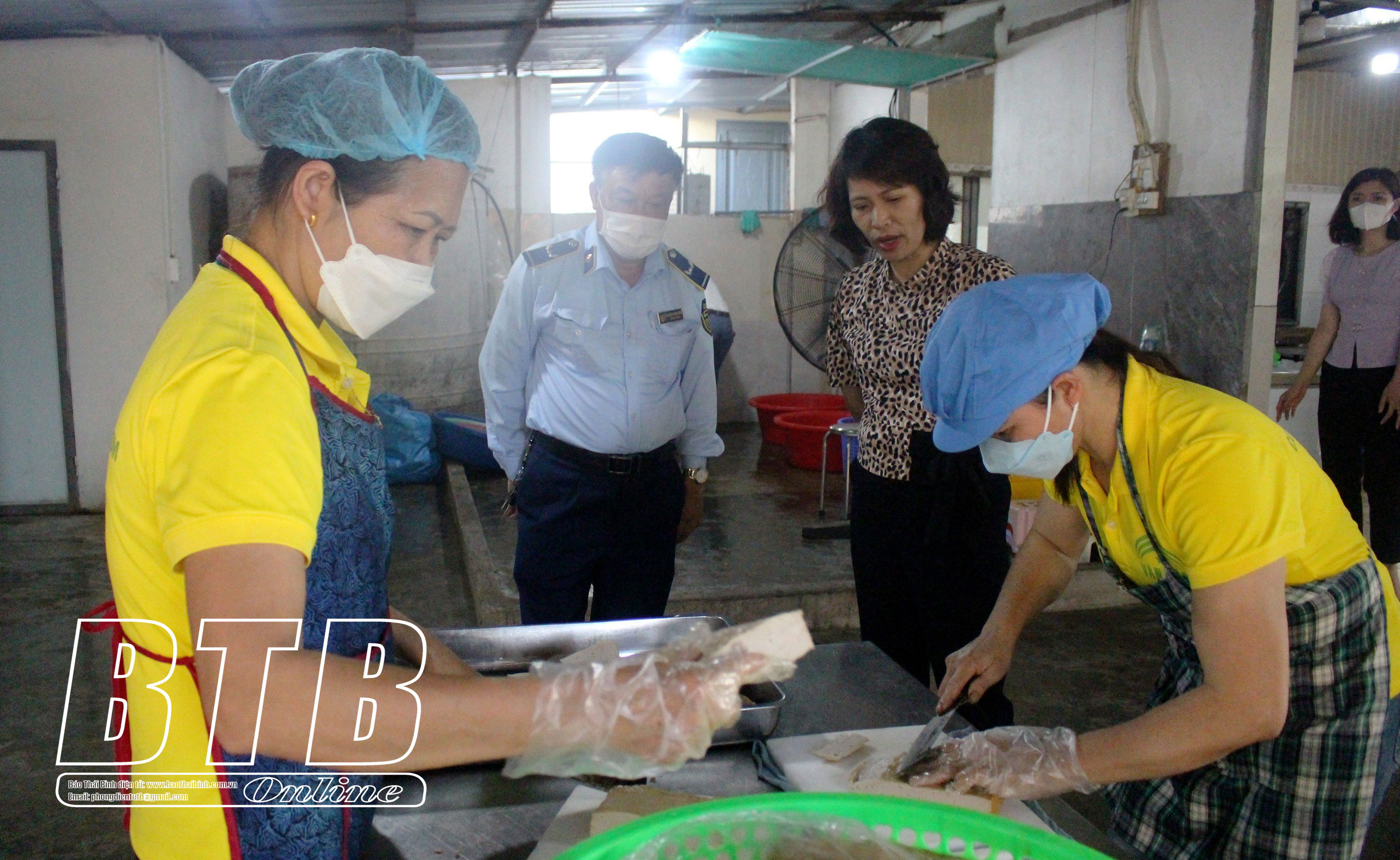 Lực lượng chức năng của Sở Y tế cùng đoàn kiểm tra liên ngành kiểm tra công tác bảo đảm an toàn vệ sinh thực phẩm tại bếp ăn tập thể Công ty May Spectre ở huyện Vũ Thư.
