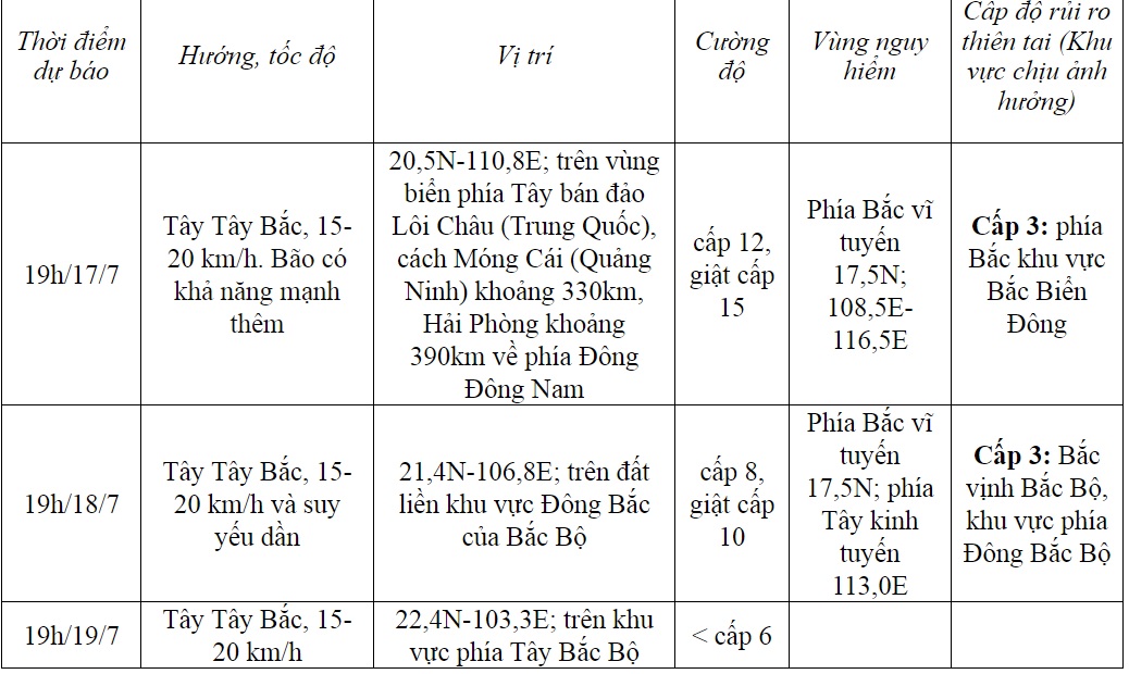 Trên biển: - Vùng biển phía Bắc khu vực Bắc Biển Đông có gió mạnh cấp 8-9, vùng gần tâm bão mạnh cấp 10-11, sau tăng lên cấp 12, giật cấp 15. Biển động dữ dội. - Từ chiều và tối ngày 17/7, Bắc vịnh Bắc Bộ(bao gồm huyện đảo Bạch Long Vỹ, Cô Tô)gió mạnh dần lên cấp 6-7, sau tăng lên cấp 8-9, vùng gần tâm bão cấp 10-12, giật cấp 15. Trên đất liền: - Từ gần sáng ngày 18/7, vùng ven biển khu vực từ Quảng Ninh đến Nam Định gió mạnh dần lên cấp 6-7, sau tăng lên cấp 8, vùng gần tâm bão cấp 9-10, giật cấp 13; khu vực sâu trong đất liền phía Đông Bắc Bộ có gió mạnh cấp 6-7, giật cấp 9. | |