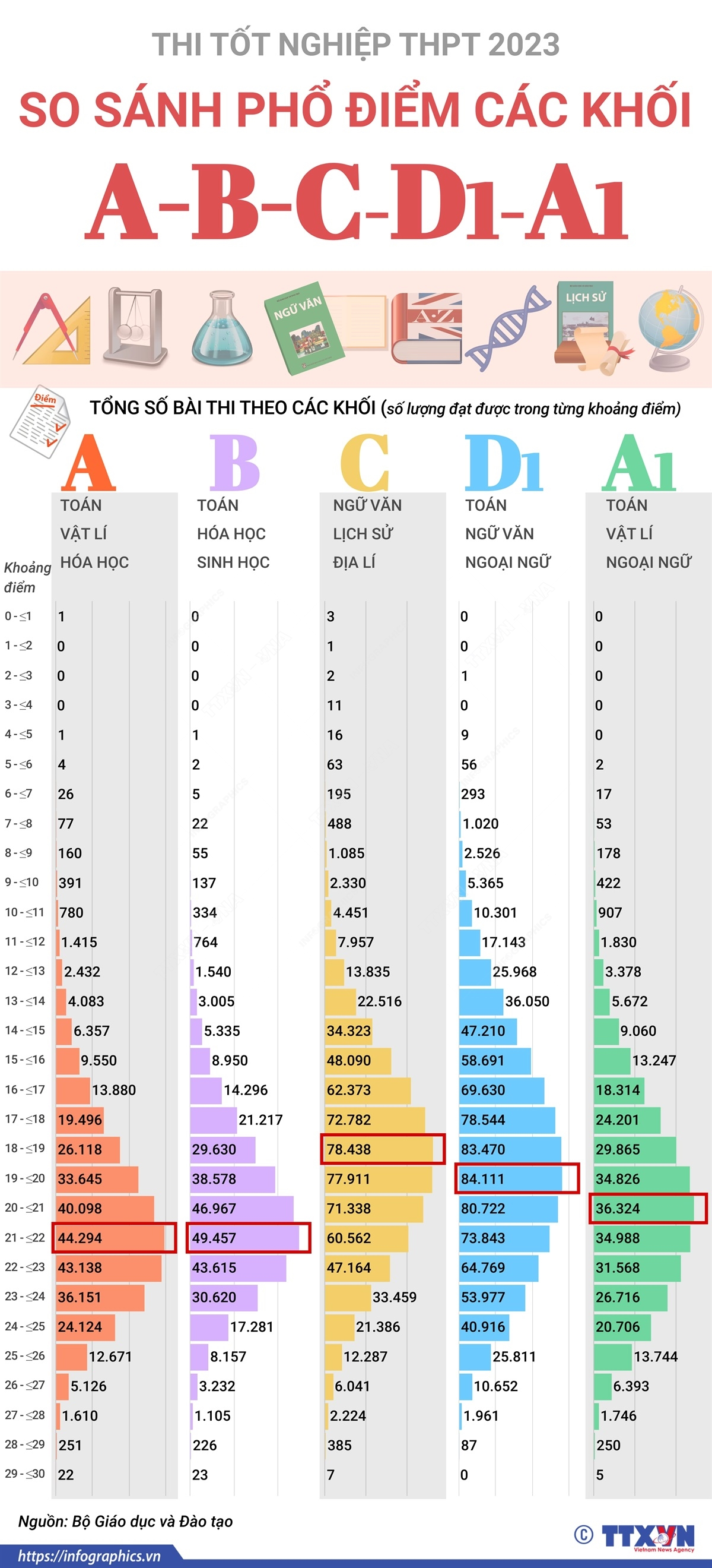 Ngày 18/7/2023, cùng với việc công bố phổ điểm các môn thi của Kỳ thi tốt nghiệp THPT năm 2023, Bộ Giáo dục và Đào tạo đã công bố kết quả phân tích phổ điểm của một số khối thi là A, B, C, D1, A1.