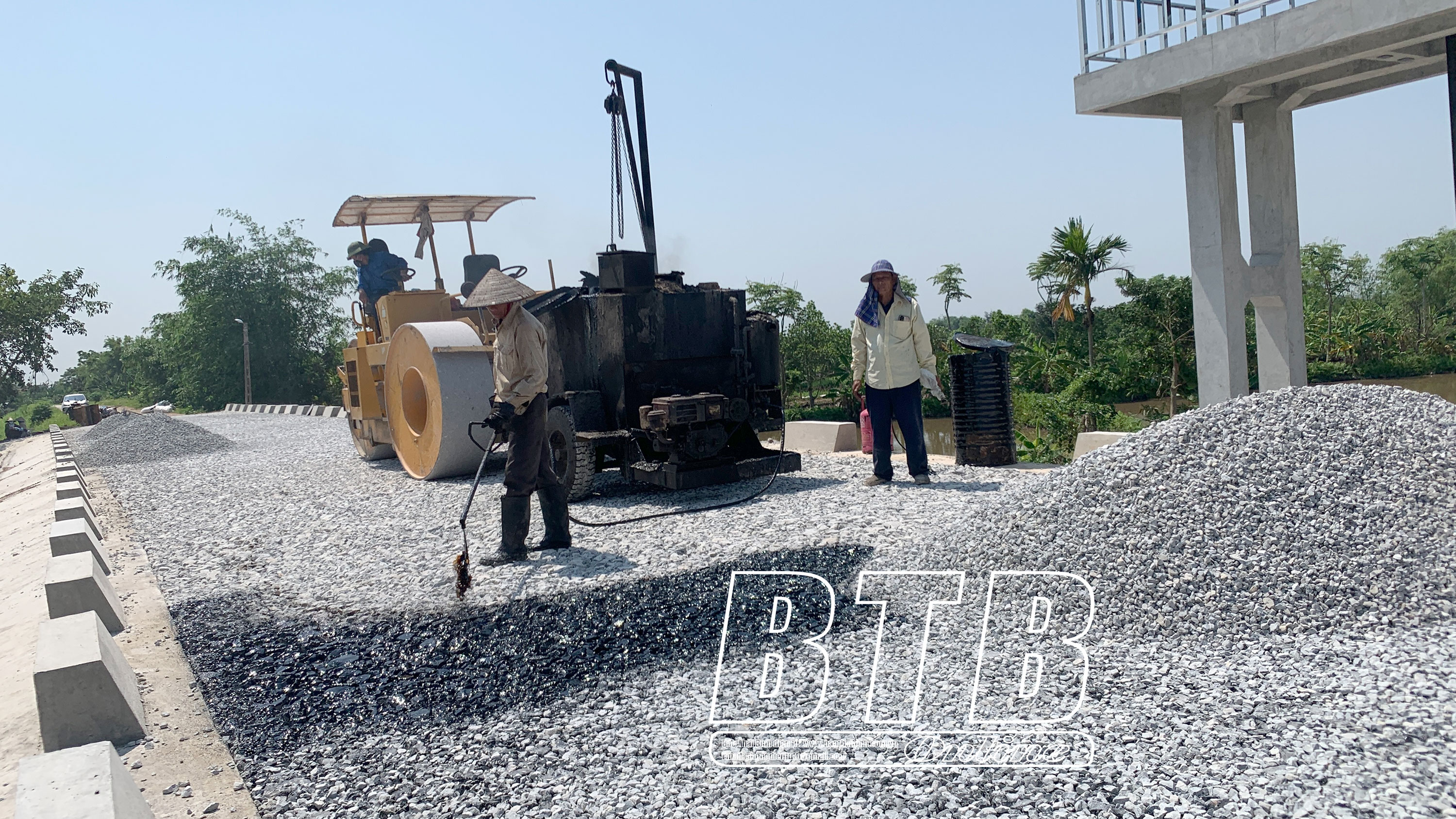Thi công láng nhựa mái đê tại đê tả Hồng Hà II, thuộc địa phận xã Minh Tân (Kiến Xương).