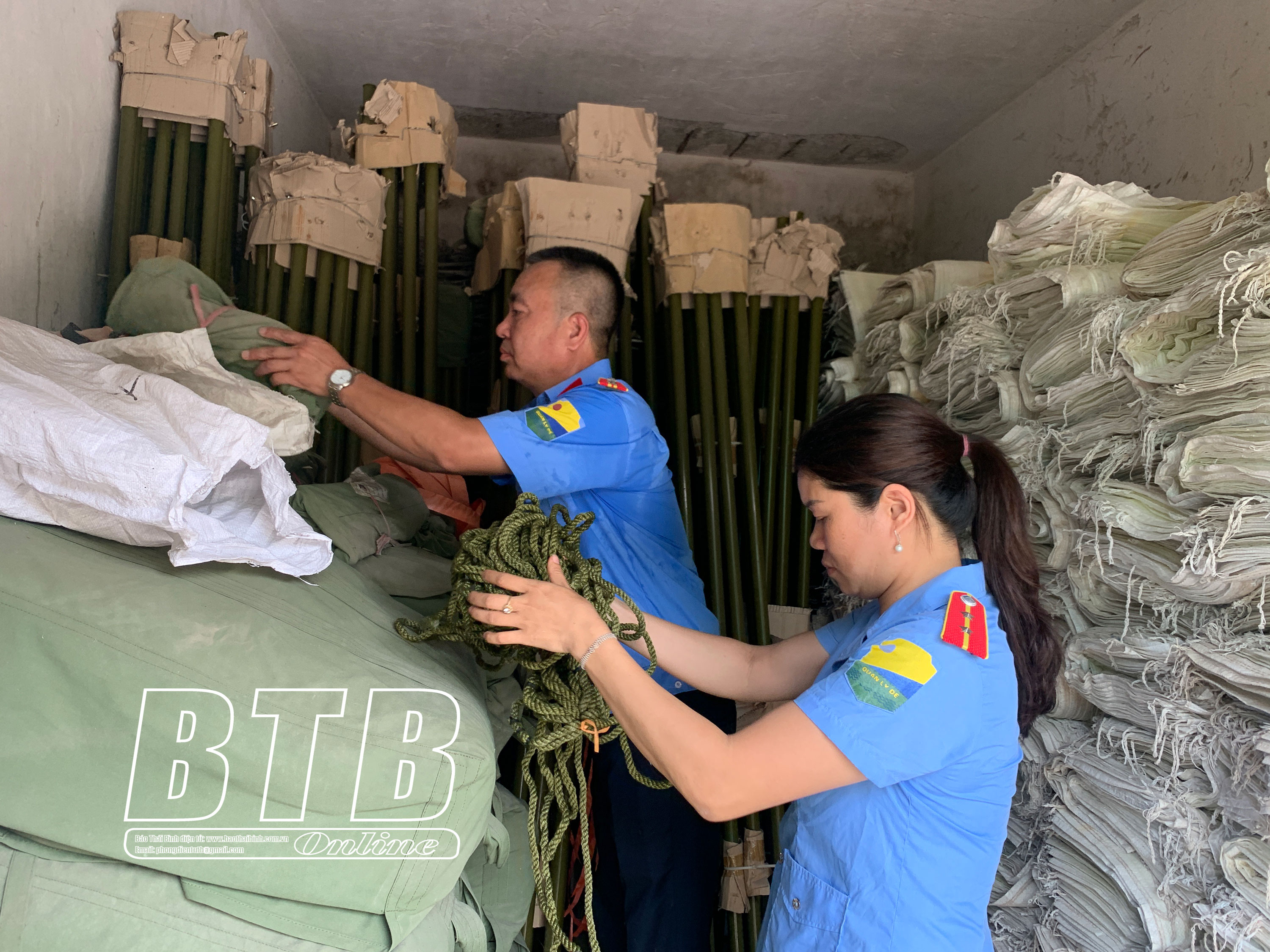 Cán bộ, nhân viên Hạt Quản lý đê huyện Đông Hưng kiểm tra kho vật tư dự trữ phục vụ công tác phòng, chống thiên tai.