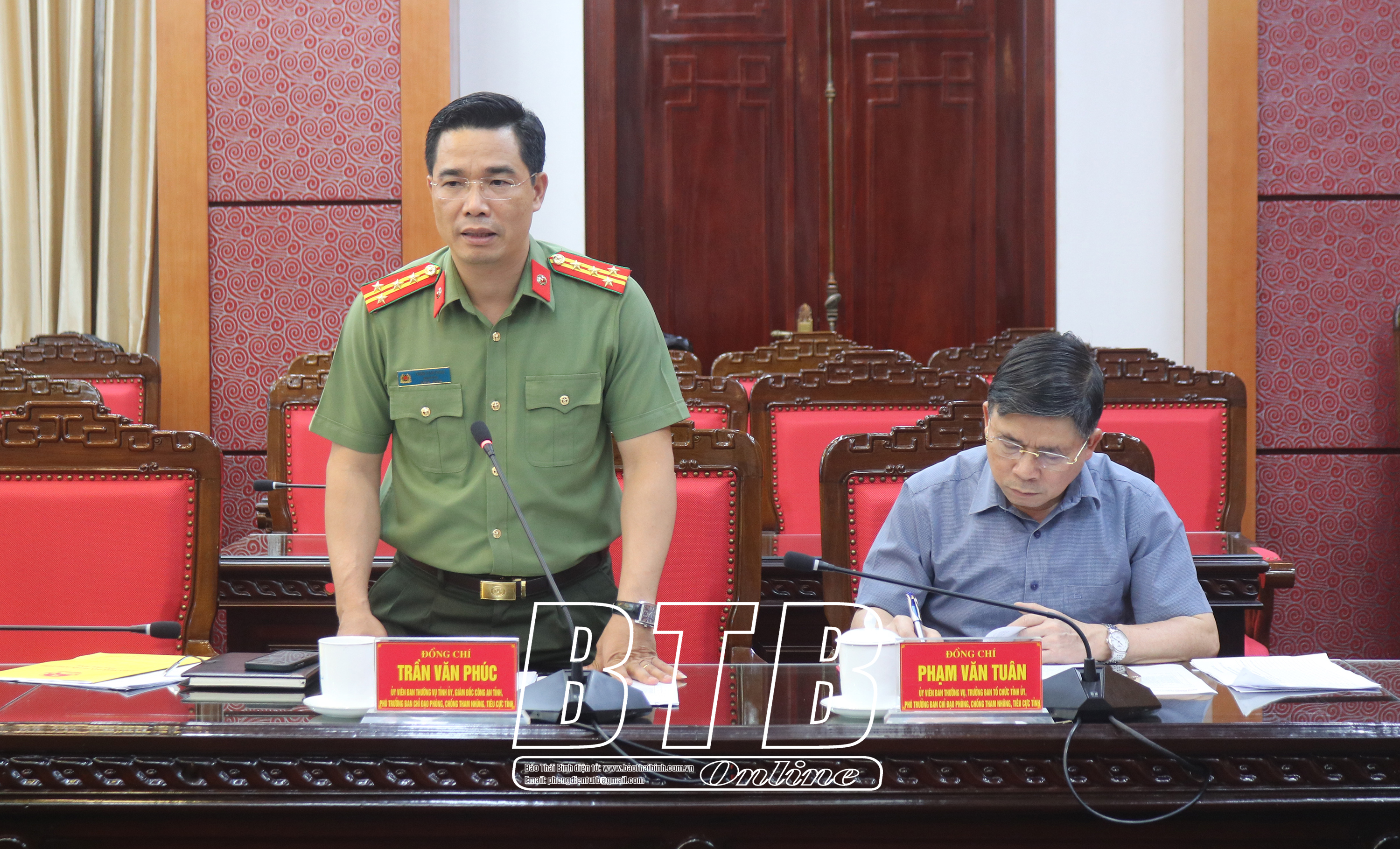 Đại tá Trần Văn Phúc, Ủy viên Ban Thường vụ Tỉnh ủy, Giám đốc Công an tỉnh phát biểu tại cuộc họp.