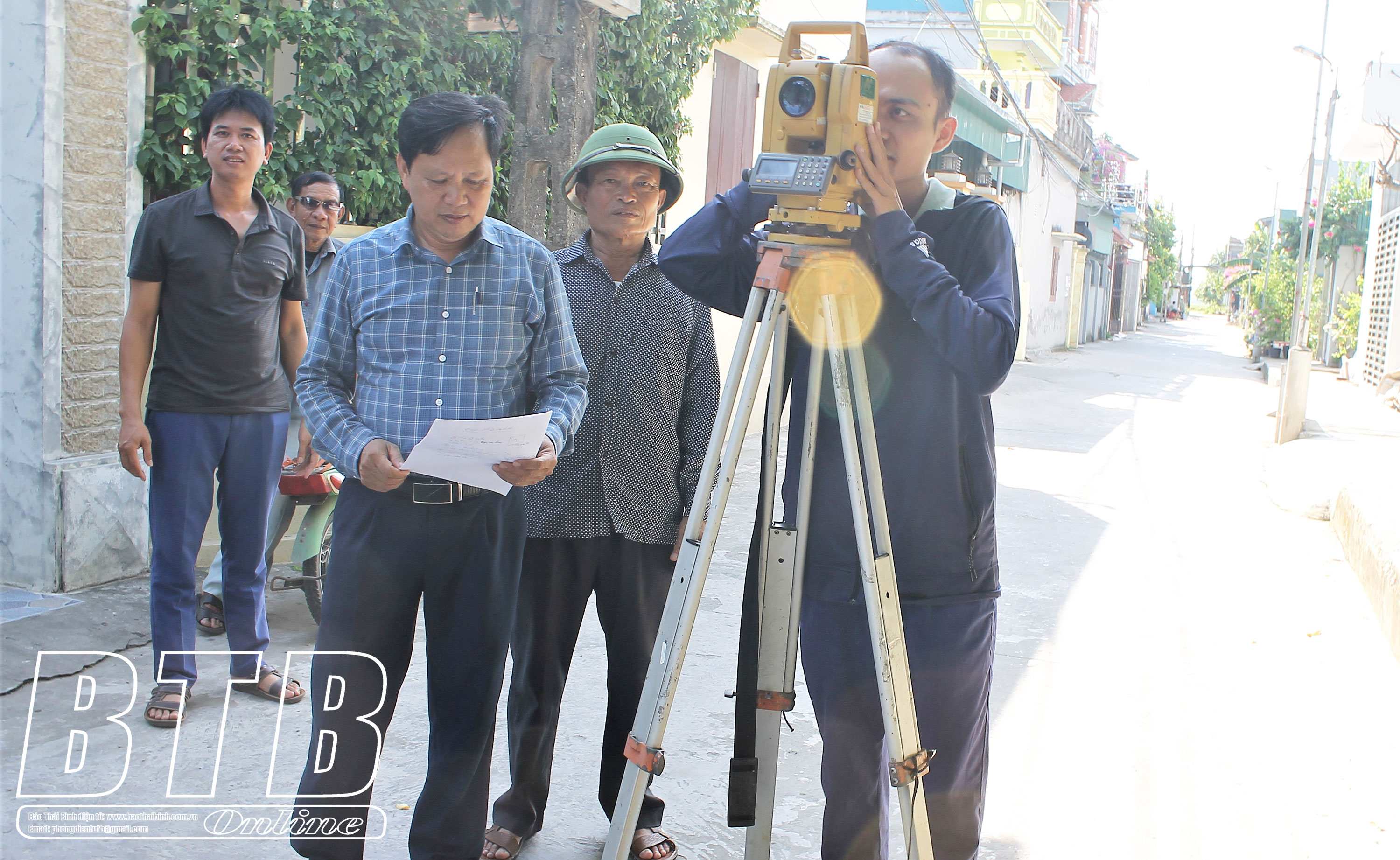 Cơ quan chuyên môn tiến hành đo đạc hiện trạng đất để thực hiện thủ tục cấp giấy chứng nhận quyền sử dụng đất cho người dân tại xã Trung An (Vũ Thư).