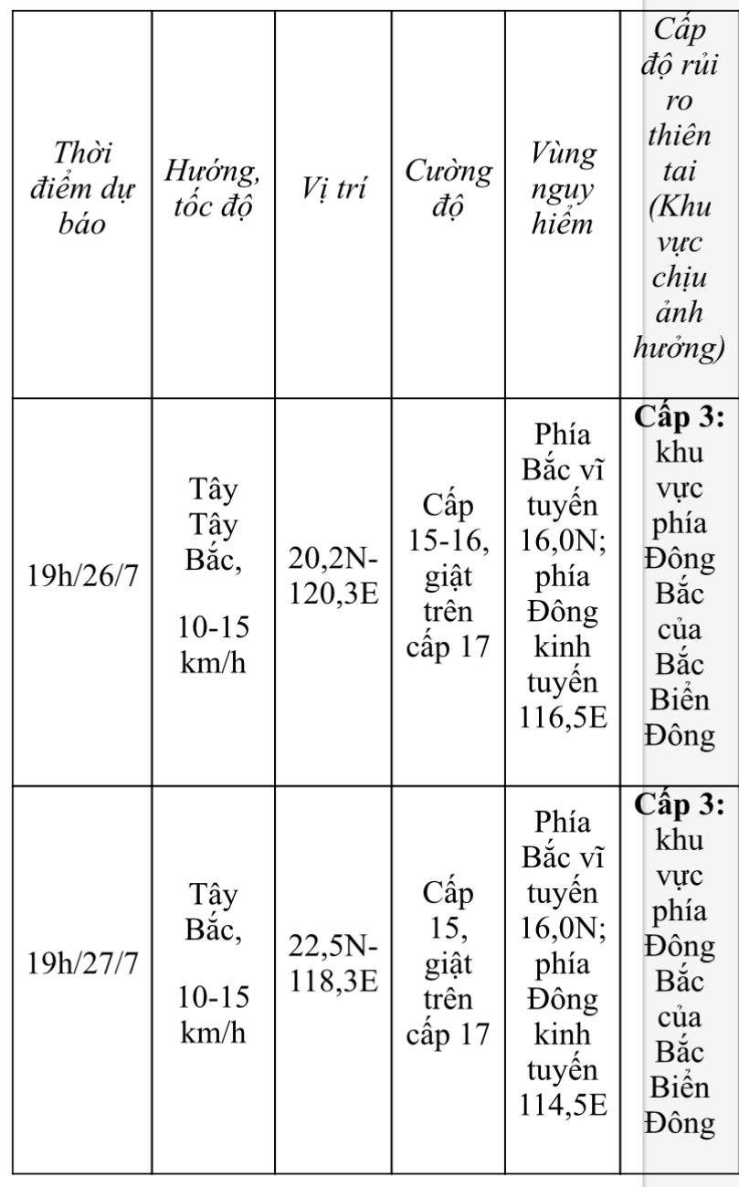 Vùng biển phía Đông Bắc của khu vực Bắc Biển Đông có gió mạnh cấp 6-7, từ chiều và đêm ngày 26/7 mạnh lên cấp 10-12, vùng gần tâm bão mạnh cấp 13-15, giật trên cấp 17; biển động dữ dội.