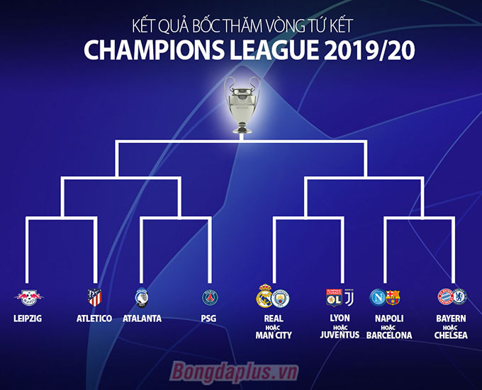 | Kết quả bốc thăm tứ kết Champions League 1. Real/Man City vs Juventus/Lyon 2. Leipzig vs Atletico 3. Napoli/Barca vs Bayern/Chelsea 4. Atalanta vs PSG |