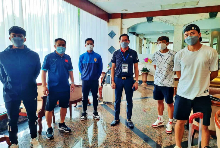 Đến tối 22/2, các cầu thủ Đinh Quý, Huỳnh Tiến Đạt, Nguyễn Thành Nhân và Trần Bảo Toàn có mặt tại Phnom Penh sau khi di chuyển bằng đường bộ, các cầu thủ Phan Tuấn Tài và Vũ Đình Hai sang theo chuyến bay hạ cánh trước giờ thi đấu khoảng 2 giờ. Ảnh: VFF