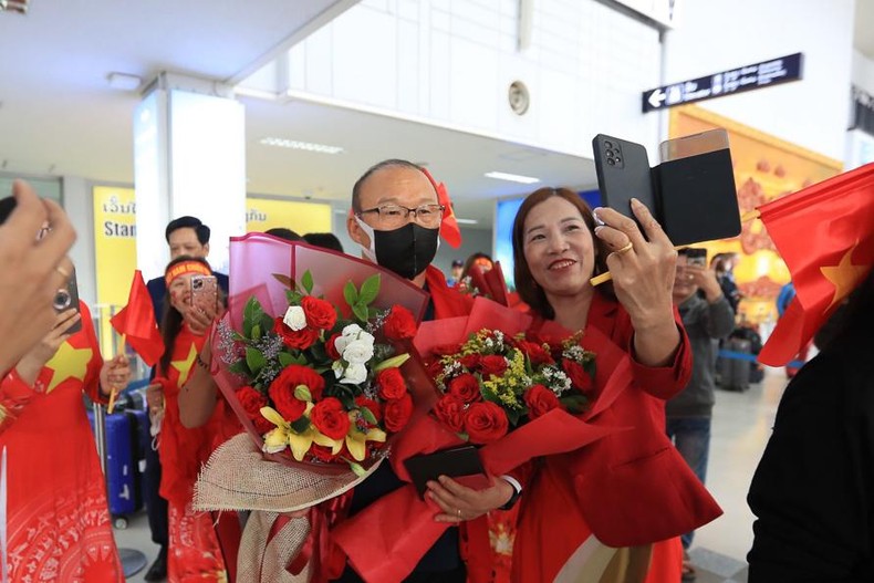 Cổ động viên Việt Nam tại Lào đón đội tại sân bay Wattay và tặng hoa chúc mừng HLV Park Hang-seo.