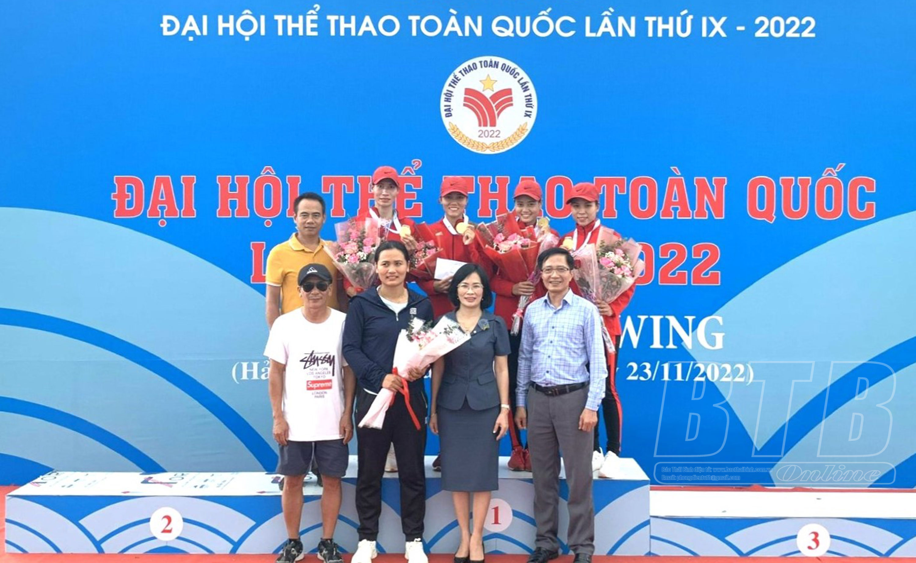 Các VĐV đua thuyền rowing của đoàn thể thao Thái Bình được trao HCV.