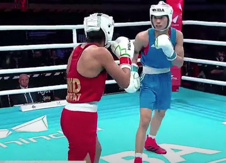 Nguyễn Thị Tâm (áo xanh) thi đấu trận chung kết với Nakhit Zareen. Ảnh chụp màn hình