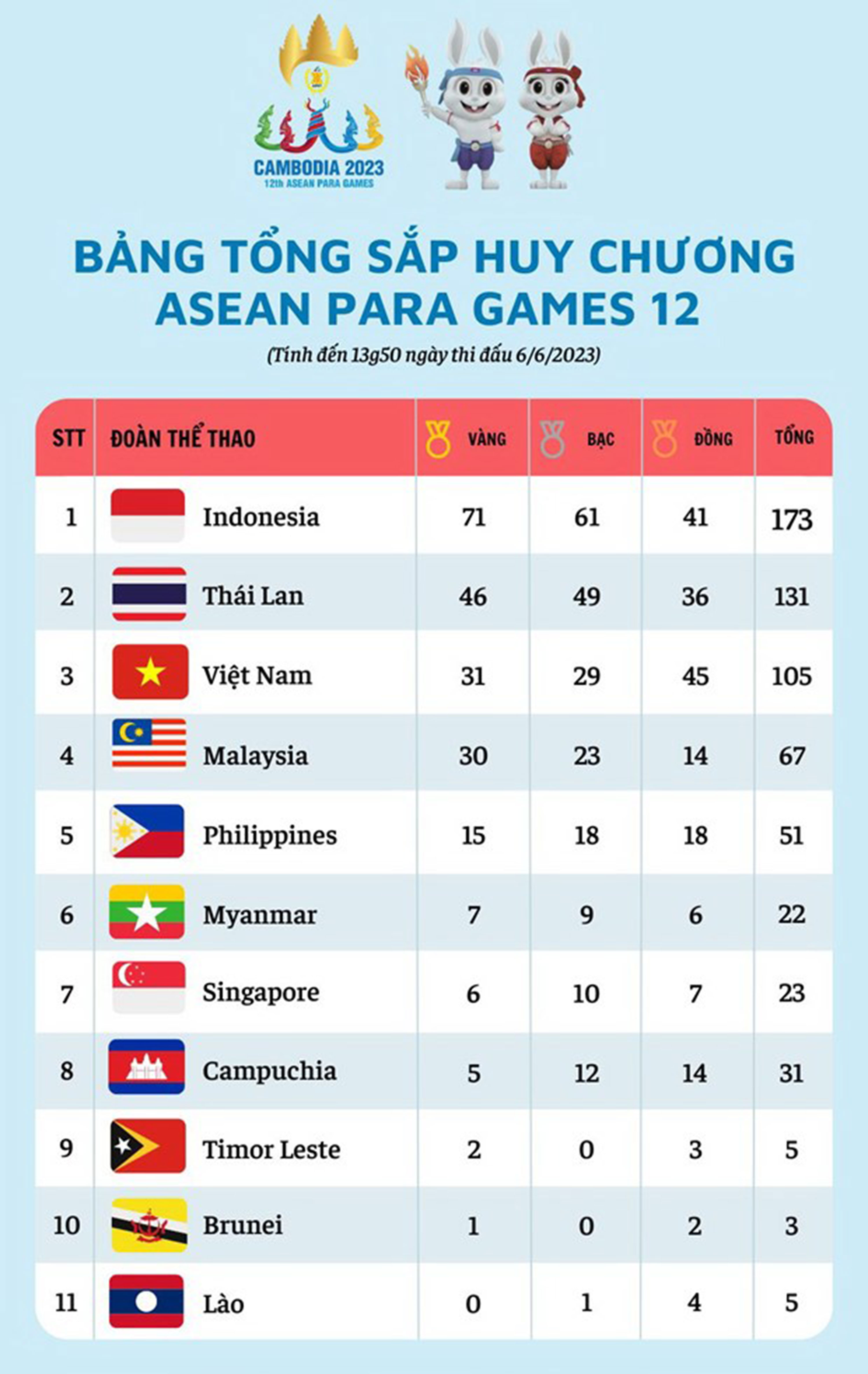 Tính đến 13g50 ngày 6/6, Đoàn Thể thao Người Khuyết tật Việt Nam đã có tổng cộng 105 huy chương các loại, gồm 31 huy chương Vàng, 28 huy chương Bạc và 45 huy chương Đồng, đứng vị trí thứ 3 bảng tổng sắp huy chương ASEAN Para Games 12.