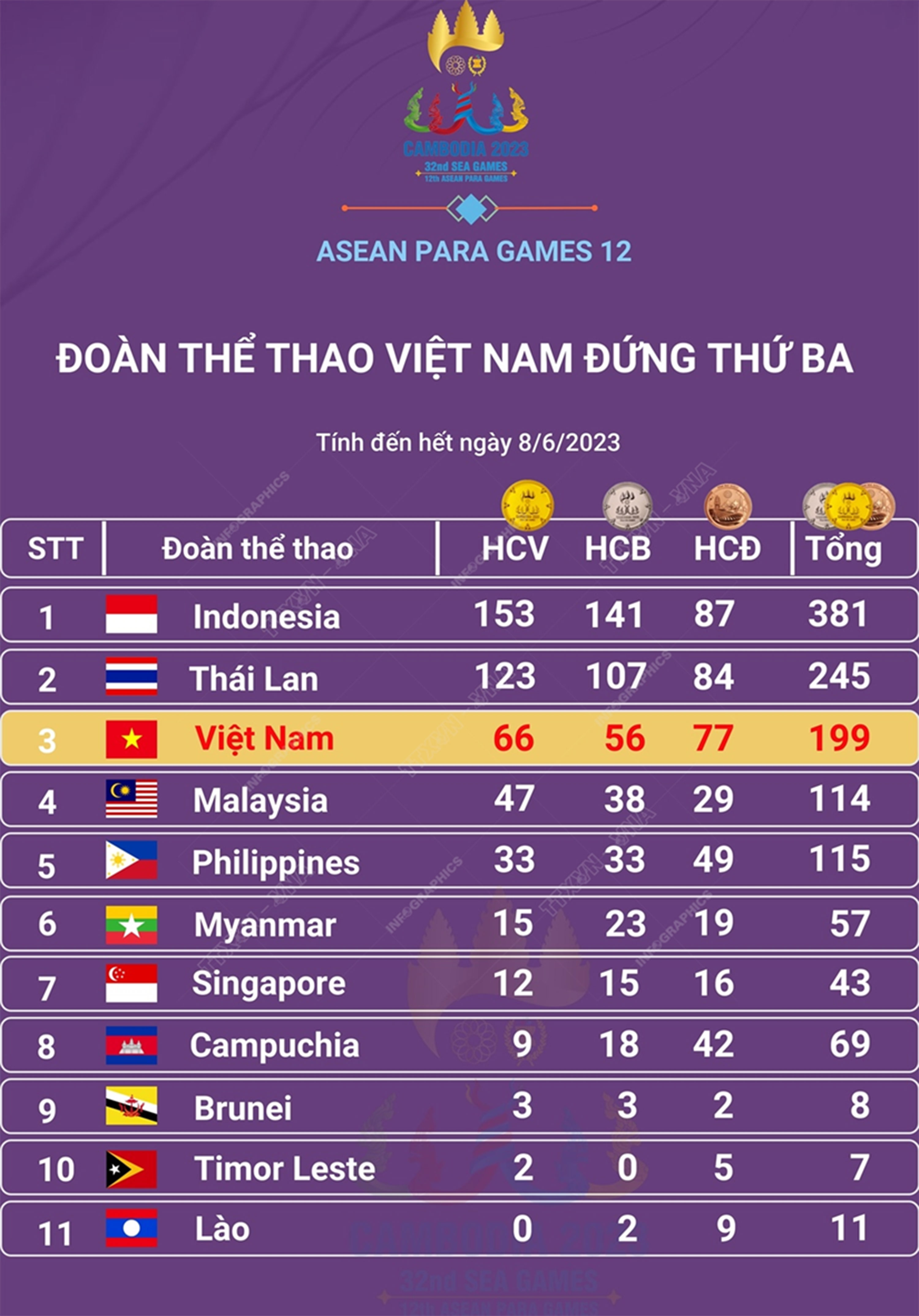 Kết thúc ngày 8/6, Đoàn Thể thao Người Khuyết tật Việt Nam xếp thứ 3 bảng tổng sắp huy chương tại ASEAN Para Games 12 với tổng cộng 66 huy chương Vàng, 56 huy chương Bạc và 77 huy chương Đồng.