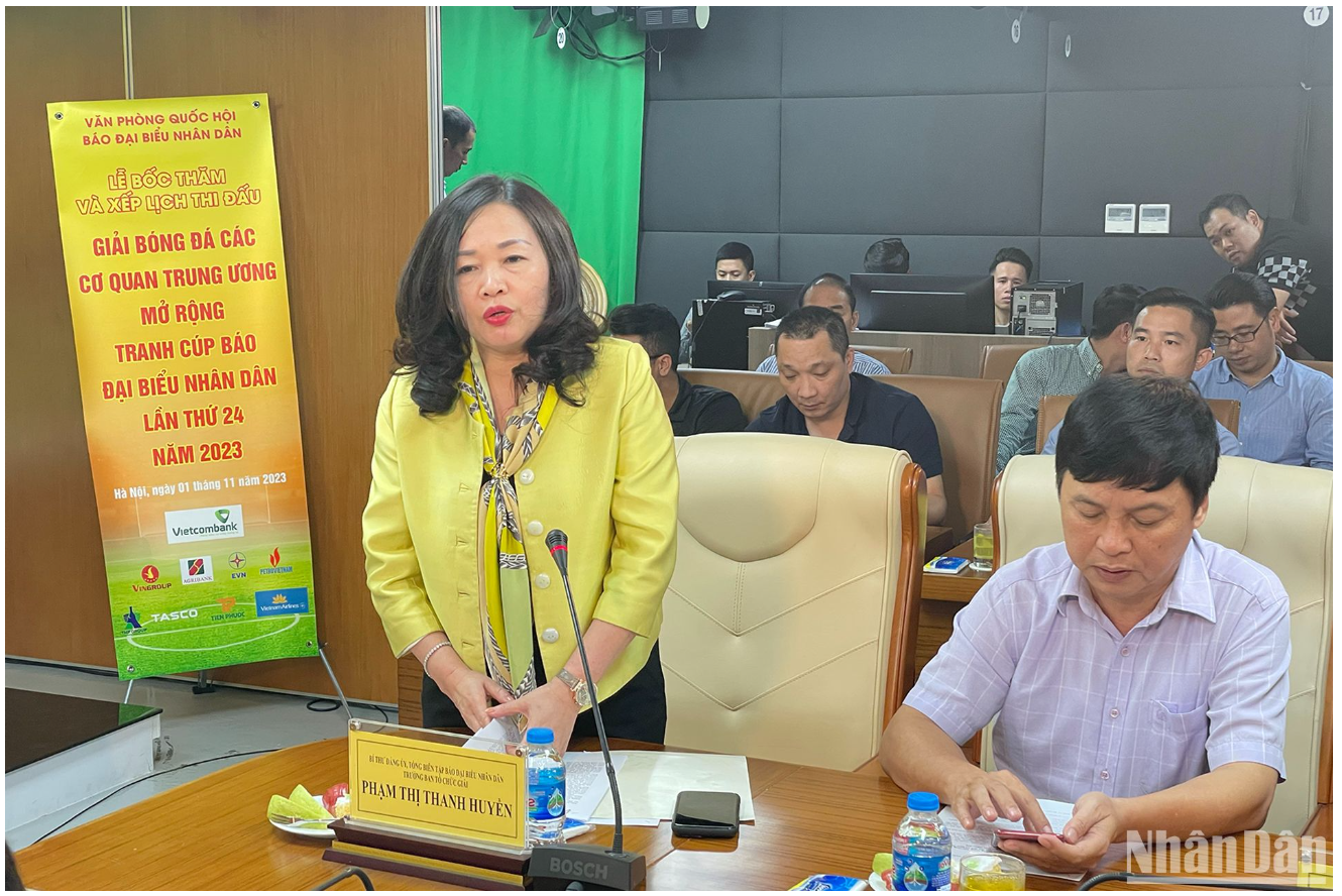 Tổng Biên tập báo Đại biểu Nhân dân, Trưởng Ban tổ chức giải Phạm Thị Thanh Huyền phát biểu tại lễ bốc thăm và xếp lịch thi đấu.