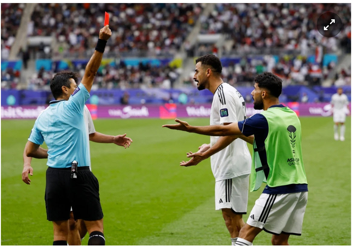 Ông Faghani rút thẻ vàng thứ hai cho trung phong Iraq. Hussein ngơ ngác vì bị truất quyền thi đấu, nhưng quyết định của "vua áo đen" Australia không thể đảo ngược.