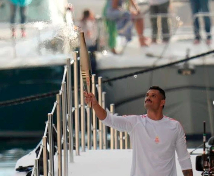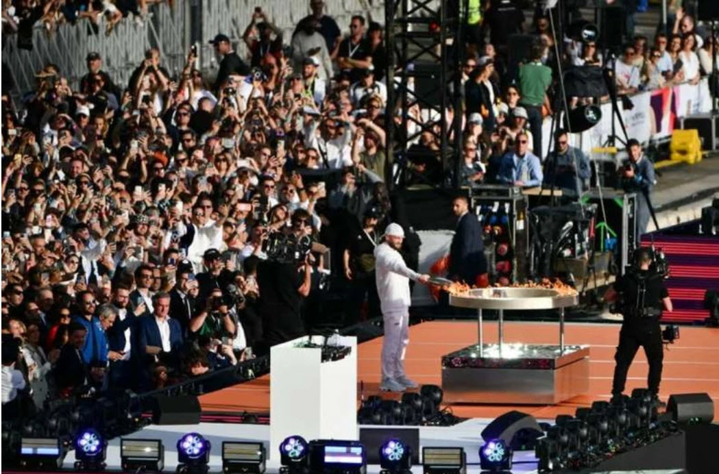 Vận động viên bơi lội người Pháp Florent Manaudou bước xuống với ngọn đuốc trên tay, rồi trao cho nhà vô địch điền kinh khuyết tật Nantenin Keita. Sau đó, ngọn lửa được chuyển tiếp cho Jul, ngôi sao nhạc rap gốc thành phố Marseille, người sẽ trực tiếp thắp sáng chiếc vạc Olympic 2024.
