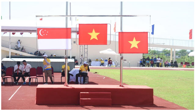 Quốc ca Việt Nam nhiều lần ngân vang trong ngày thi đấu đầu tiên của bộ môn điền kinh tại Đại hội thể thao học sinh Đông Nam Á.