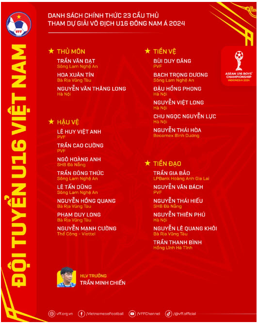 Danh sách chính thức 23 cầu thủ U16 Việt Nam tham dự Giải U16 Đông Nam Á 2024.