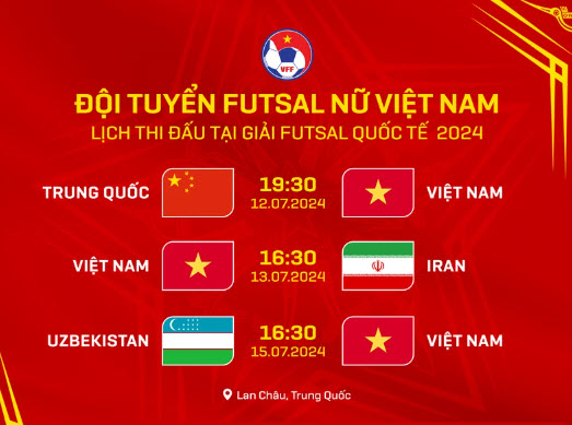 Theo kế hoạch, đội tuyển futsal nữ quốc gia sẽ lên đường sang Lan Châu (Trung Quốc) vào ngày 10/7 để tham dự giải giao hữu quốc tế từ ngày 11/7 đến 15/7 với các đội Iran, Uzbekistan và chủ nhà Trung Quốc. Thầy trò huấn luyện viên Nguyễn Đình Hoàng sẽ lần lượt gặp đội tuyển futsal nữ Trung Quốc, Iran và Uzbekistan vào các ngày 12/7, 13/7 và 15/7.