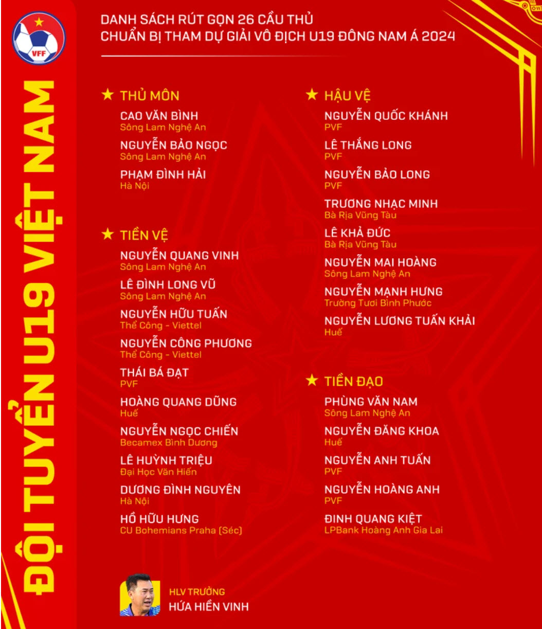 Huấn luyện viên Hứa Hiền Vinh rút gọn danh sách đội tuyển U19 Việt Nam xuống còn 26 cầu thủ.