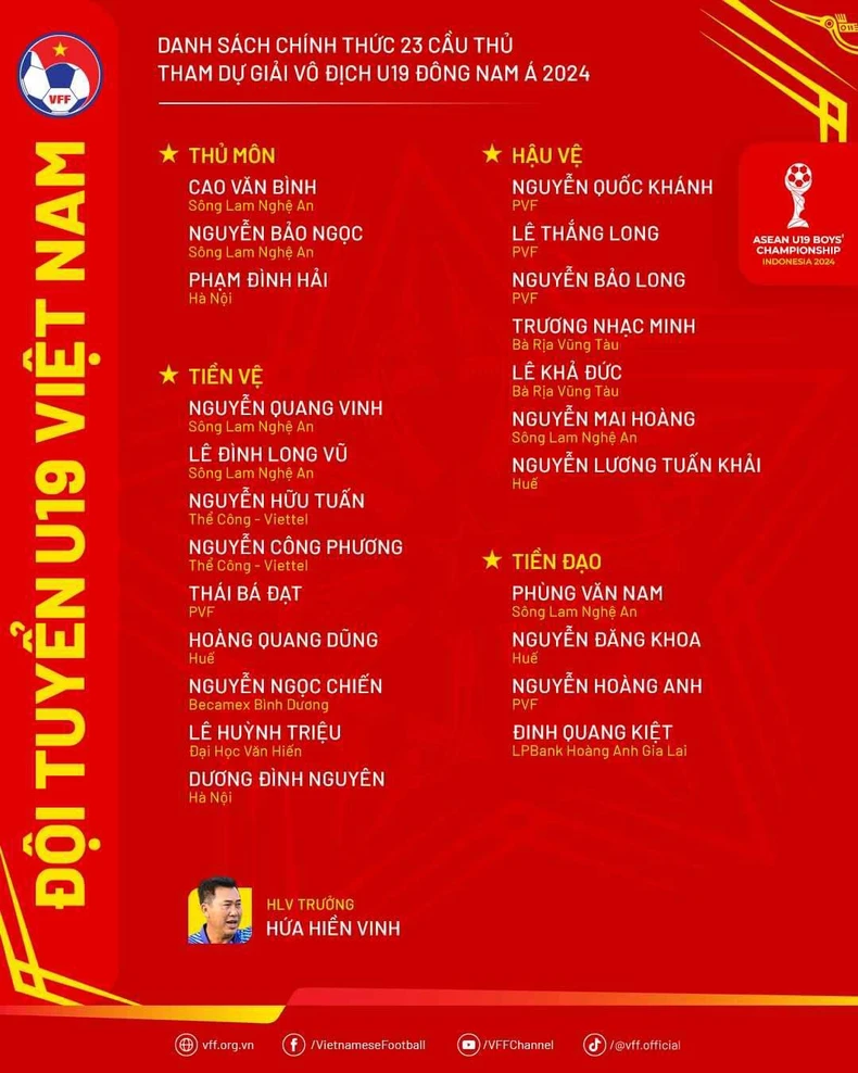 Danh sách chính thức 23 tuyển thủ U19 Việt Nam tham dự Giải vô địch U19 Đông Nam Á 2024.