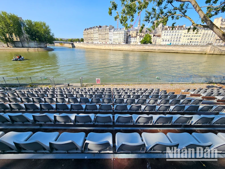 Công tác lắp đặt khán đài di động sắp hoàn thiện để phục vụ chương trình diễu hành bằng thuyền trên sông Seine kéo dài 6km trong khuôn khổ Lễ khai mạc Thế vận hội Olympic 2024.