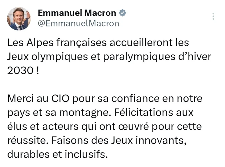 Tổng thống Pháp Emmanuel Macron hoan nghênh quyết định của Ủy ban Olympic quốc tế(IOC), và đã có dòng chia sẻ trên mạng xã hội X như sau: “Xin cảm ơn Ủy ban Olympic Quốc tế vì đã tin tưởng vào đất nước và những ngọn núi hùng vĩ của chúng tôi. Xin được gửi lời chúc mừng tới các nhà chức trách và những người đã nỗ lực vì sự thành công này. Hãy cùng nhau tiến hành một mùa Thế vận hội đổi mới, bền vững và bao trùm.”
