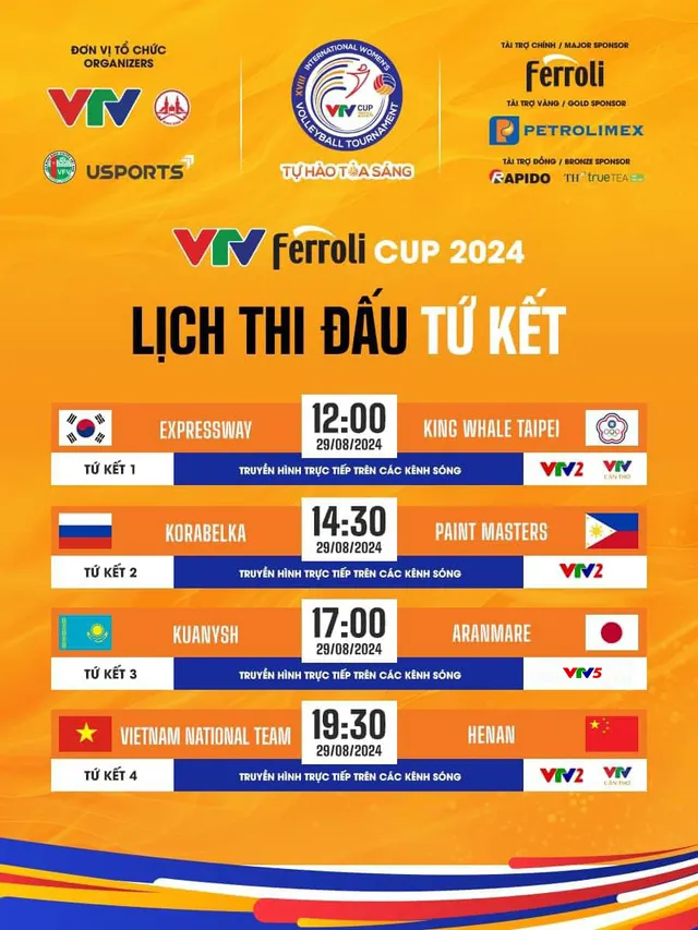 Trong khi đó, Expressway (Hàn Quốc) với chiến thắng ấn tượng trước Kuanysh đã giành ngôi nhất bảng A. Kết quả này đưa đại diện của "xứ kim chi" gặp King Whale Taipei (Đài Bắc Trung Hoa). Trận tứ kết giữa Expressway và King Whale Taipei diễn ra sớm nhất lúc 12h00 và được trực tiếp trên kênh VTV2, VTV Cần Thơ, VTVgo và kênh youtube VTV Thể Thao.