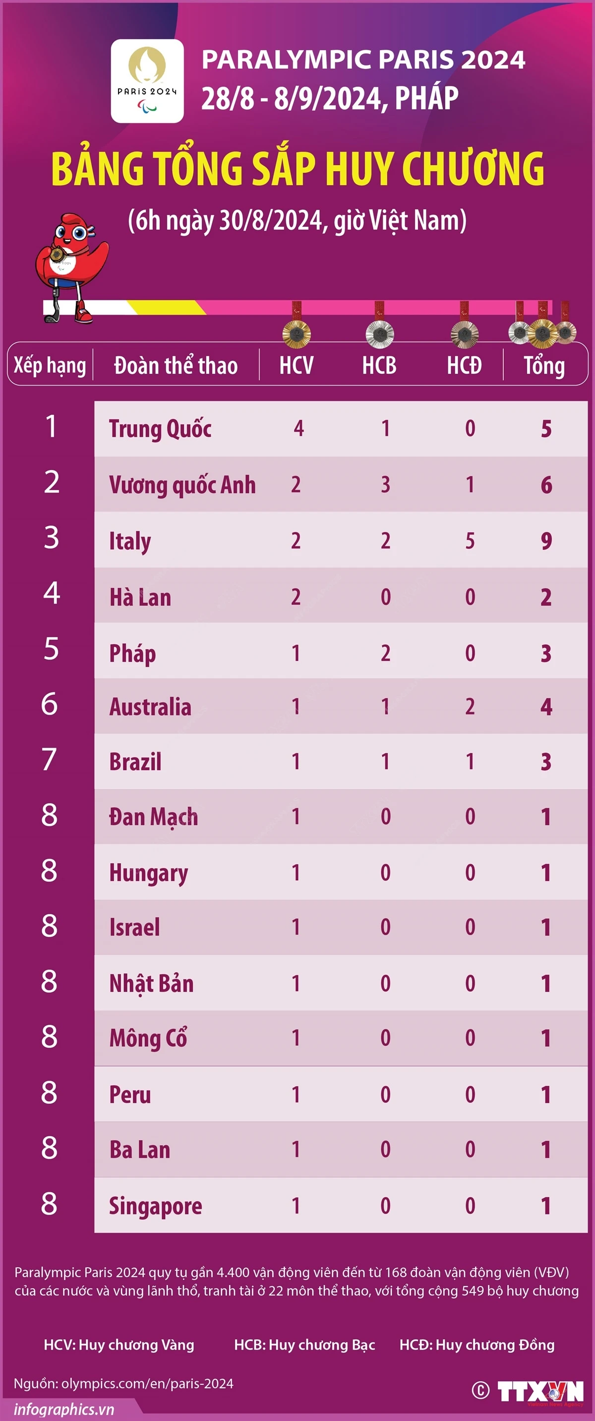 Paralympic Paris 2024: Bảng tổng sắp huy chương tính đến 6h ngày 30/8