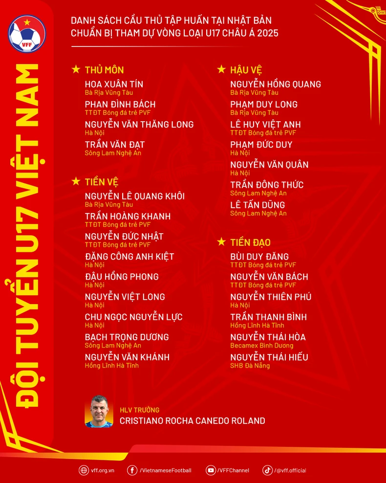 Danh sách 26 cầu thủ U17 Việt Nam tập huấn tại Nhật Bản.