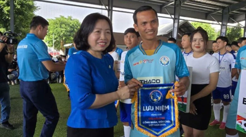 Phó Chủ tịch Tổng Liên đoàn Lao động Việt Nam Thái Thu Xương tặng cờ lưu niệm cho đại diện các đội bóng.