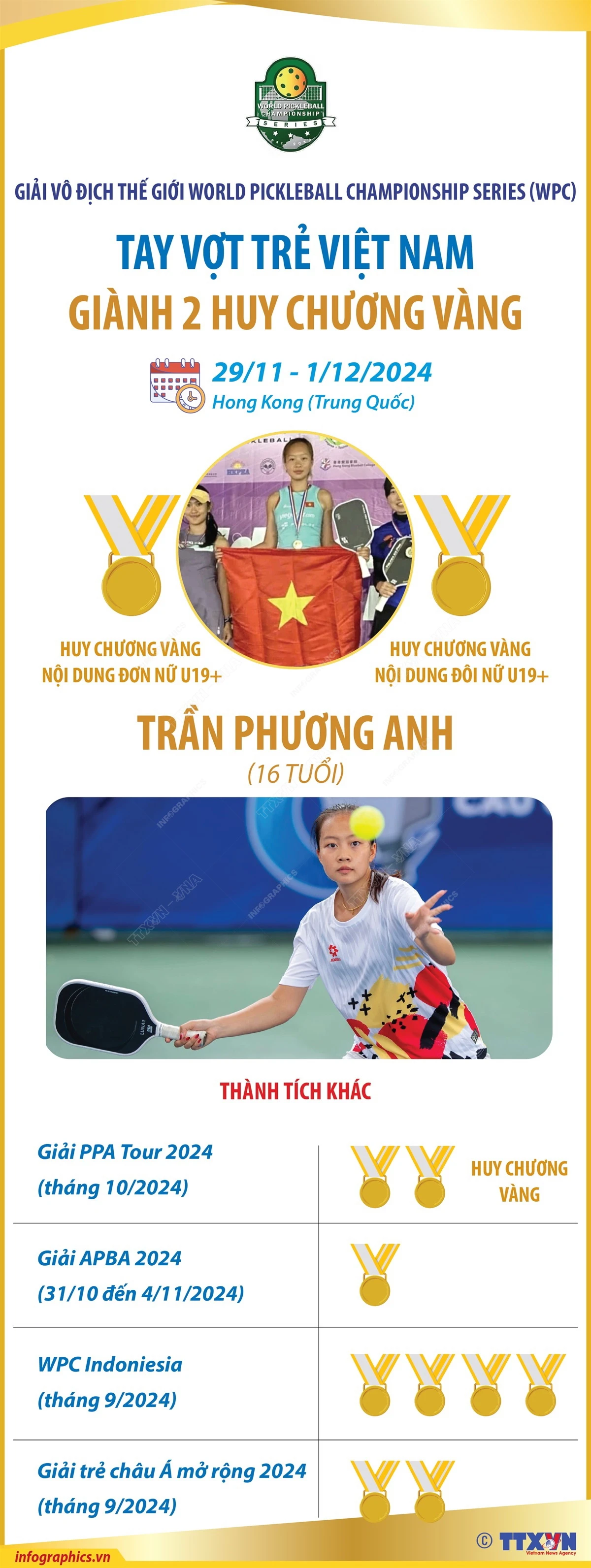 Tại Giải vô địch thế giới World Pickleball Championship Series được tổ chức ở Hong Kong (Trung Quốc), vận động viên Trần Phương Anh của Việt Nam đã giành Huy chương Vàng ở cả 2 nội dung đôi nữ.