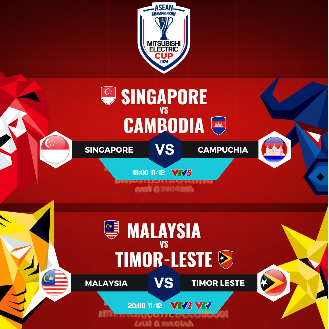 Hôm nay 11/12 sẽ diễn ra các trận đấu ở lượt trận thứ 2 bảng A Giải vô địch bóng đá Đông Nam Á (ASEAN Cup) 2024 với 2 trận đấu: Singapore - Campuchia, Malaysia - Timor Leste.
