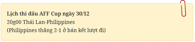 Theo lịch thi đấu, trận tái đấu giữa Thái Lan và Philippines sẽ diễn ra trên sân Rajamangala (Bangkok) vào lúc 20 giờ hôm nay (30/12).