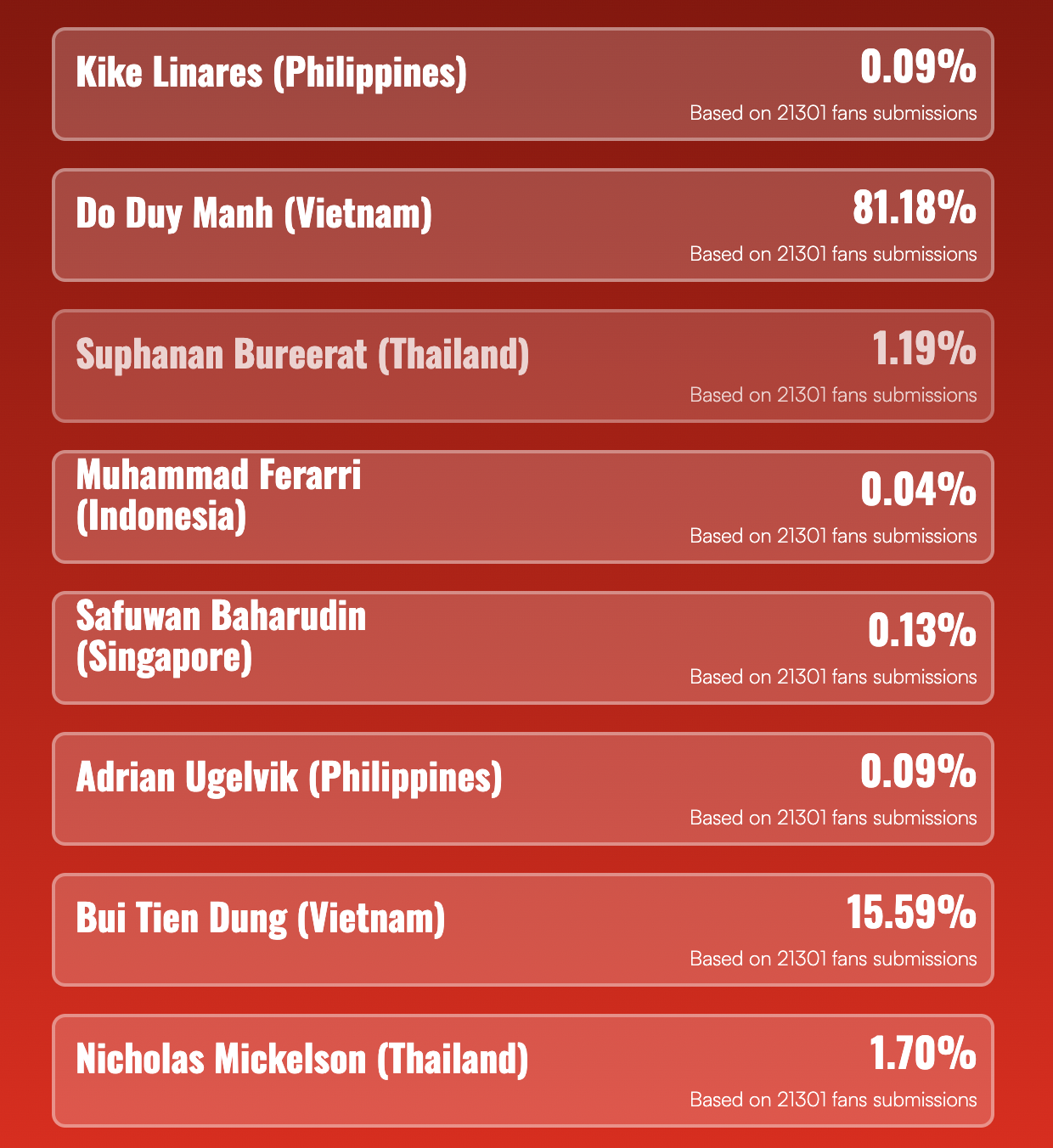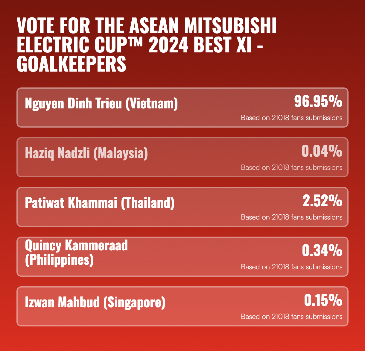 Theo đó, trong cuộc bầu chọn trên trang chủ của ASEAN Cup tính đến 10h ngày 13/1, Đình Triệu nhận được 96,95% lượt bầu chọn. Xếp thứ 2 trong danh sách này là thủ môn Patiwat Khammai (2.52%).