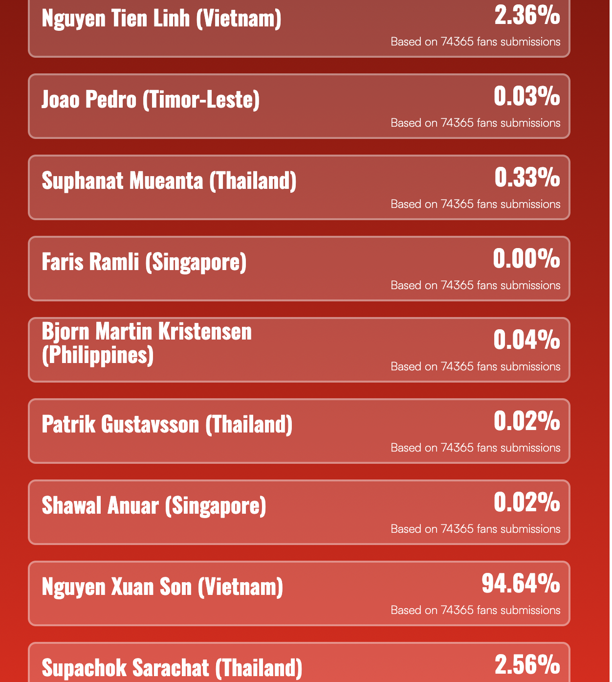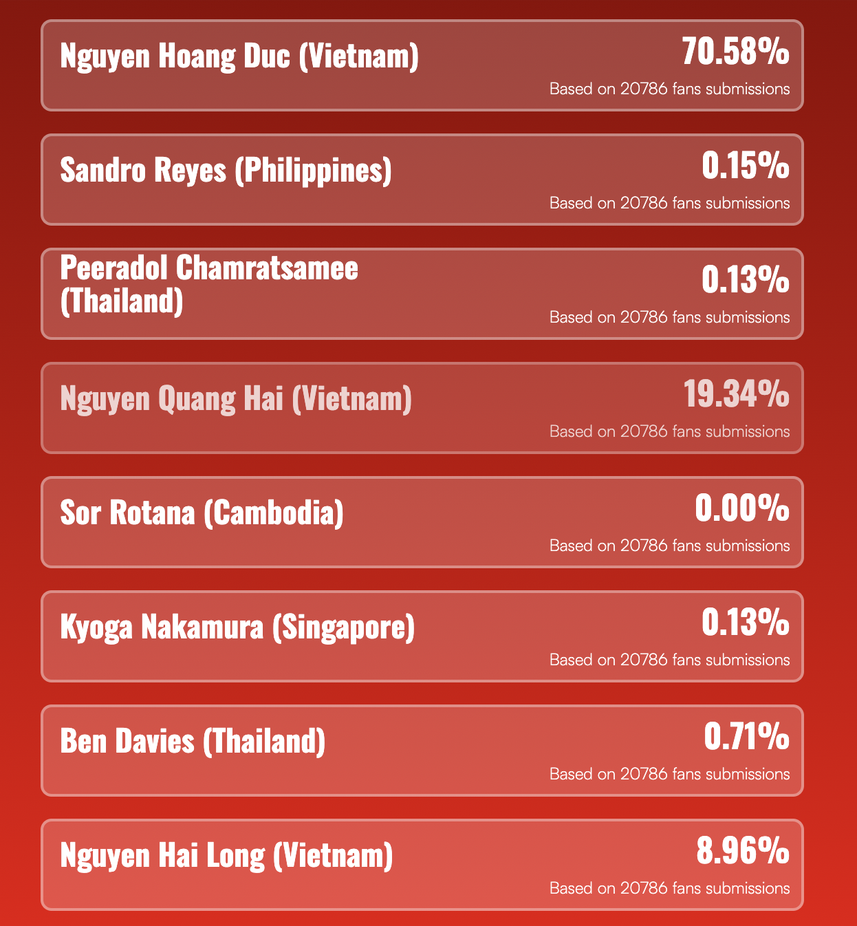 Theo kết quả ghi nhận, Xuân Son dẫn đầu với 94,64% phiếu bầu. Theo sau là cầu thủ Supachok Sarachat với 2,56%. Tiến Linh xếp thứ ba với 2,36%.