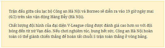 Bên kia chiến tuyến, huấn luyện viên Joaquin Gomez của Borneo khẳng định quyết tâm trước trận đấu quan trọng gặp Công an Hà Nội: "Chúng tôi đến đây thi đấu với một đội bóng rất mạnh, sở hữu huấn luyện viên giỏi và những cầu thủ tài năng. Tuy nhiên, chúng tôi đã có sự chuẩn bị tốt nhất. Chúng tôi không đến đây để du lịch mà để tận hưởng cảm giác được thi đấu và hướng tới chiến thắng. Thứ hạng hiện tại của chúng tôi chưa tốt, nhưng với sự chuẩn bị kỹ lưỡng và sự hỗ trợ từ các trợ lý tài năng, chúng tôi đặt mục tiêu giành trọn 3 điểm, dù đối thủ rất mạnh".