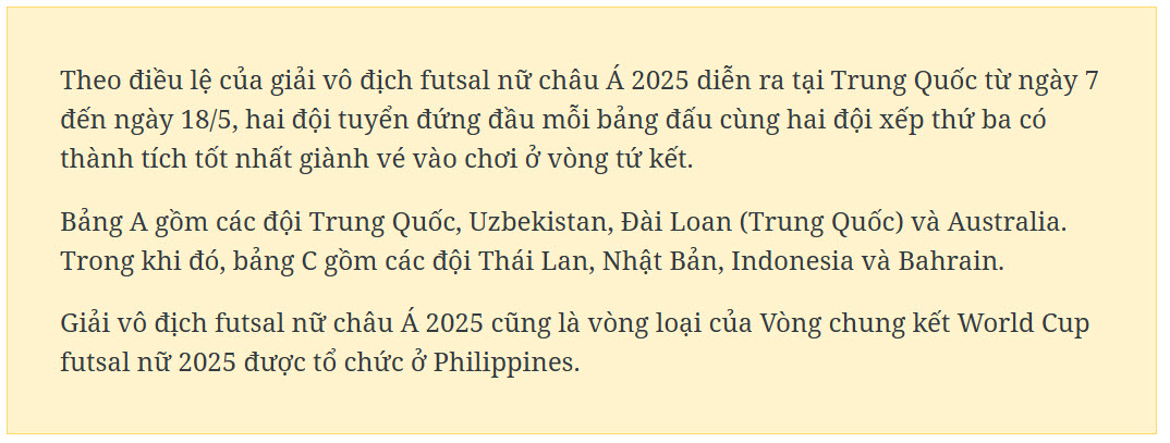 Ở vòng loại futsal nữ châu Á 2025 diễn ra hồi tháng 1 vừa qua, đội tuyển futsal nữ Việt Nam có màn thể hiện tốt cùng phong độ cao. Các cô gái Việt Nam đã lần lượt thắng 5-1 Myanmar, thắng 21-0 Macau (Trung Quốc) và hòa 2-2 Đài Loan (Trung Quốc). Qua đó đứng vị trí nhất bảng D và giành quyền vào Vòng chung kết.