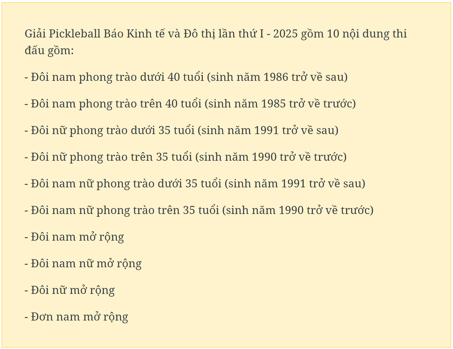 Theo quy định của Ban tổ chức, ở nội dung đôi nữ, các vận động viên là Kiện tướng quốc gia, các huấn luyện viên những môn pickleball, tennis, bóng bàn, cầu lông không được tham gia nội dung phong trào; vận động viên pickleball đã đoạt giải Nhất, Nhì trên 17 tuổi ở các nội dung tại Giải Vô địch pickleball Cúp các câu lạc bộ quốc gia; hệ thống VVP tour, VNtimes; các vận động viên đoạt giải quốc tế hoặc có điểm PICKLEBALL VIETNAM 3.5+ không được tham gia nội dung phong trào.