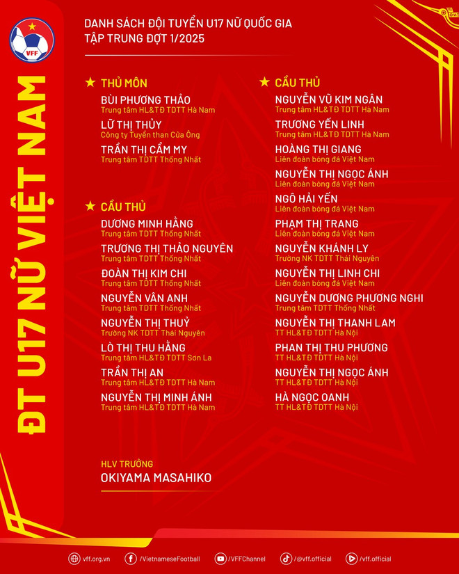 Danh sách Đội tuyển U17 Nữ Việt Nam chuẩn bị cho trận giao hữu quốc tế với Đội tuyển U17 Nữ Thái Lan.