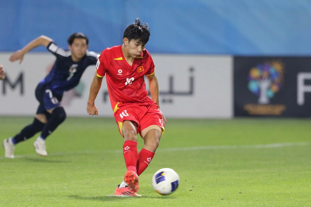 Trần Gia Bảo đá phạt đền thành công ở phút bù thứ sáu giúp Việt Nam hòa Nhật Bản 1-1 ở lượt hai bảng B U17 châu Á 2025, tại sân Okadh, Arab Saudi tối 7/4/2025.